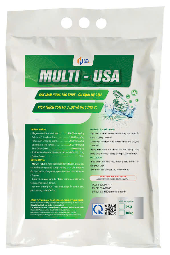 - MULTI-USA là hợp chất dưới dạng khoáng hữu cơ nên tôm dễ dàng hấp thu qua mang, vỏ cơ, giúp tôm mau chắc thịt, chắc cơ, cứng vỏ.