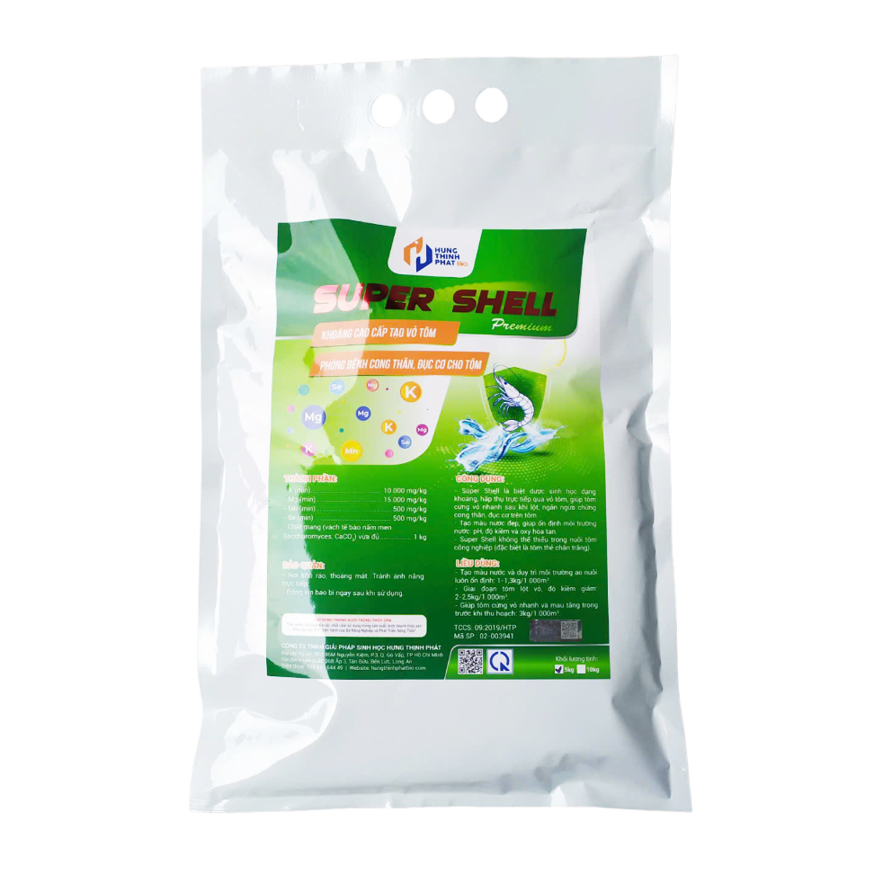 - Super Shell là biệt dược sinh học dạng khoáng, hấp thụ trực tiếp qua vỏ tôm, giúp tôm cứng vỏ nhanh sau khi lột, ngăn ngừa chứng cong thân, đục cơ trên tôm.